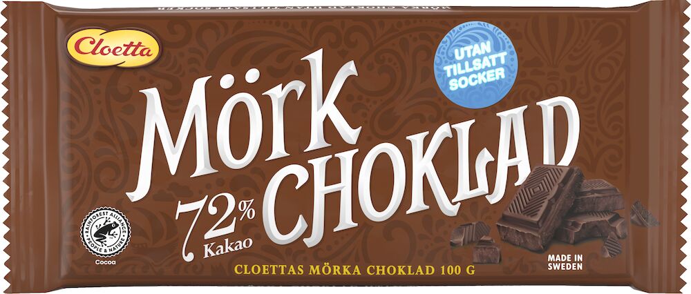 Cloetta Mörk choklad utan tillsatt socker är en delikat mörk chokladkaka med en kakaohalt på 72%. Sedan 1914 har Cloetta gjort olika varianter av choklad utan något tillsatt socker. Den höga kakaohalten ger den goda smaken som passar perfekt för den som älskar mörk choklad. Chokladkakan innehåller 100 g.