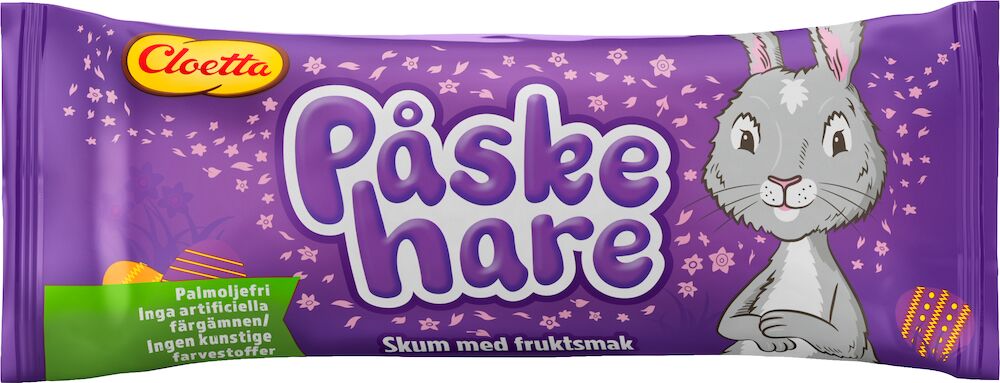 Cloetta Påskehare är godisbiten som inte får glömmas till påsk! En extra stor påskhare på det populära fruktiga påskeskummet. Perfekt när du vill ha en munsbit i farten eller en riktigt stor bit påskstämning. En söt och fluffig hare med en smak som är tydligt besläktad med skumtomtarna i Cloetta Juleskum. Men är det samma smak? Det är det ingen som vet. Förpackningen innehåller 22 gram.