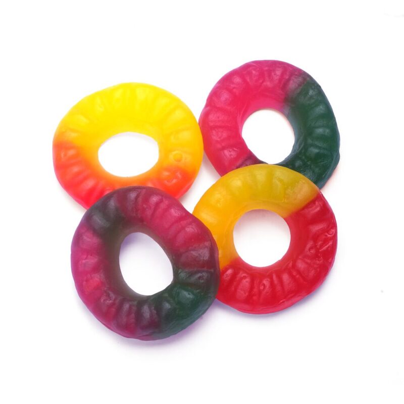 Vingummi med fruktsmak/frugtsmag Ingredienser: socker/sukker, glukossirap, glukos-fruktossirap, stärkelse/stivelse, syra (citronsyra), vegetabiliska oljor (kokos, raps), naturliga aromer, koncentrat från (sötpotatis/sød kartoffel/søtpotet, äpple/æble/eple, rädisa/radise/reddik, körsbär/kirsebær), ytbehandlings-/overfladebehandlingsmiddel (karnaubavax/voks), färgämnen/farvestoffer (karmin, klorofyllinkopparkomplex, kurkumin).