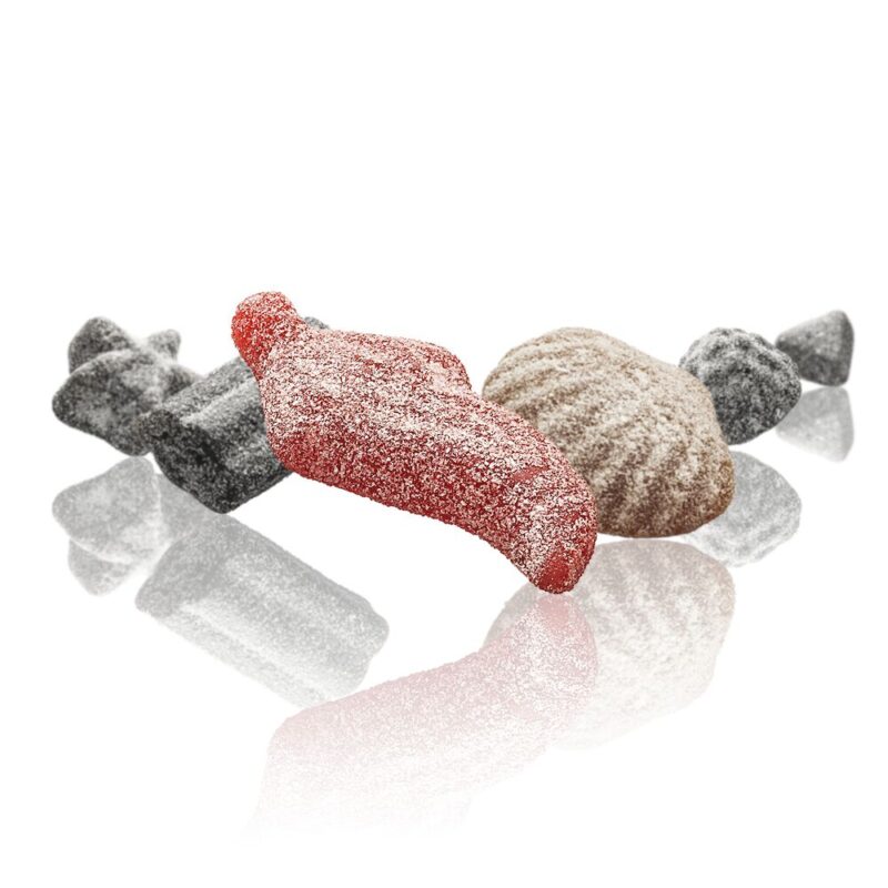 Konfektyrblandning med lakritssmak Ingredienser: socker, glukossirap, glukos-fruktossirap, stärkelse, VETEMJÖL, modifierad stärkelse, ammoniumklorid (=salmiak), lakritsextrakt, fuktighetsbevarande medel (sorbitoler, glycerol), färgämnen (E153, E150c, E160c), salt, aromer, stabiliseringsmedel (E471). Blandningsförhållandet kan variera.
