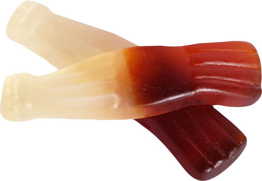 VINGUMMI MED COLASMAK Ingredienser: glukossirap, socker/sukker, vatten/vand, gelatin, syra (citronsyra), arom, vegetabiliska oljor (kokos, raps), karamelliserat socker/karamelliseret sukker, ytbehandlings-/overfladebehandlingsmiddel (karnaubavax/voks).