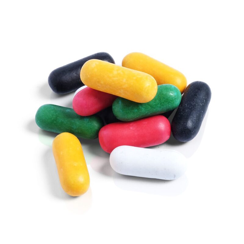 socker/sukker, melass, VETEMJÖL/HVEDE-/HVETEMEL, lakritsextrakt 0.7%, modifierad stärkelse/stivelse, glukossirap, gelatin, maltodextrin, färgämnen/farvestoffer (e171, e153, e141, e120, e160a), aromer, vegetabiliska oljor (kokos, raps), ytbehandlings-/overfladebehandlingsmidler (karnaubavax/voks, bivax/bivoks).