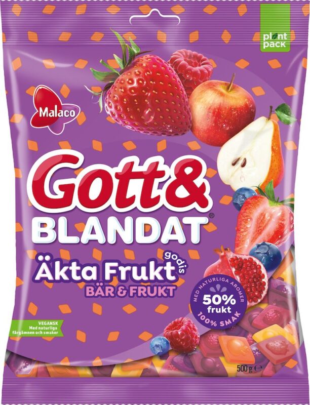 Malaco Gott & Blandat Äkta Fruktgodis innehåller hela 50 % frukt som kommer från fruktpuré och fruktjuicer, vilket ger godiset en naturligt fräsch och fruktig smak. Produkten är både vegansk och gelatinfri och innehåller endast naturliga färgämnen och smaker. Gott & Blandat Äkta Fruktgodis Bär & Frukt innehåller godisbitar med sex olika smaker; rött äpple, päron, jordgubbe, blåbär, granatäpple och hallon. Påsen innehåller 220 gram. 50 % frukt, 100 % smak!