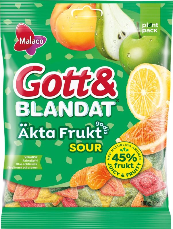 Malaco Gott & Blandat Äkta Fruktgodis Sour innehåller hela 45 % frukt som kommer från fruktpuré och fruktjuicer, vilket ger godiset en naturligt saftig och fruktig smak. Produkten är vegansk och innehåller endast naturliga färgämnen och smaker. Gott & Blandat Äkta Fruktgodis Sour innehåller sursandade godisbitar med olika smaker; citron, persika, päron, mandarin, apelsin och äpple. Påsen innehåller 180 gram. 45 % frukt - 100 % smak!