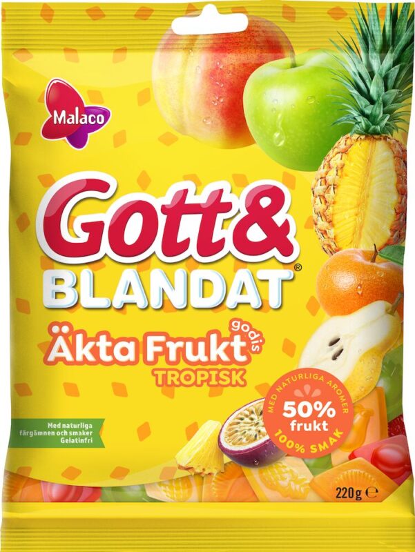 Malaco Gott & Blandat Äkta Fruktgodis innehåller hela 50 % frukt som kommer från fruktpuré och fruktjuicer, vilket ger godiset en naturligt fräsch och fruktig smak. Produkten är både vegansk och gelatinfri och innehåller endast naturliga färgämnen och smaker. Gott & Blandat Äkta Fruktgodis Tropisk innehåller godisbitar med sex olika smaker; grönt äpple, päron, passionsfrukt, ananas, persika och mandarin. Påsen innehåller 220 gram. 50 % frukt, 100 % smak!