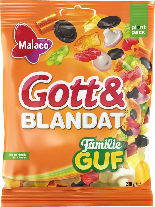 Malaco Gott & Blandat Familie Guf är den perfekta godispåsen till familjen. I Familie Guf finns det många blandade godisbitar, allt från från frukt till lakrits. Produkten kommer från början från Danmark där Guf eller ”guffa” står för att ”mumsa i sig”. En mumsig påse med vingummi för både stora och små. Påsen innehåller 210 g godis.