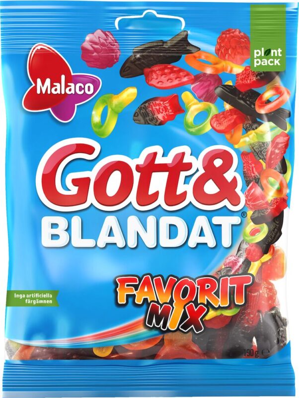 Malaco Gott & Blandat Favoritmix innehåller favoriterna från lösviktssortimentet. Det här är en perfekt godispåse för de som gillar en mix av godis. Här hittar du allt från saltlakritsfiskar, fruktnappar, jordgubbar, hallon/lakrits-fisk till skogsbär. Påsen innehåller 190 g godis.