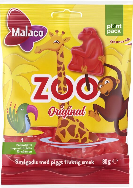 Malaco Zoo är ett av Sveriges mest kända godisvarumärken med sin fruktiga smak. Både innehållet och påsens design med apan, giraffen och papegojan är sanna svenska klassiker i godishyllan. Godispåsen passar bra till kalaset eller i godisskålen. Godispåsen innehåller 80 g.