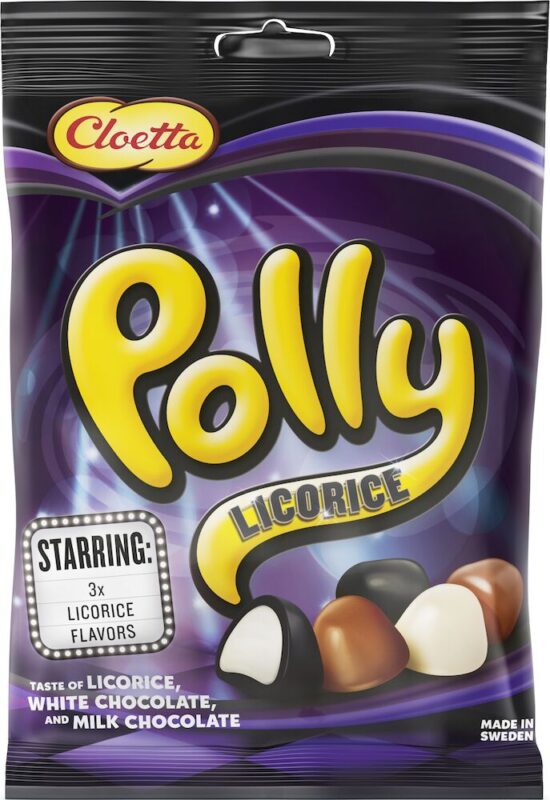 Polly Licorice är härligt sega skumtoppar dragerade med en ljuvlig chokladsmak. Det är den ultimata skumtoppen för dig som vill avnjuta en mix av Polly och lakrits! Kombinationen av ett frestande segt inre med smaken av choklad gör godispåsen så mumsig att det är omöjligt att bara ta en.