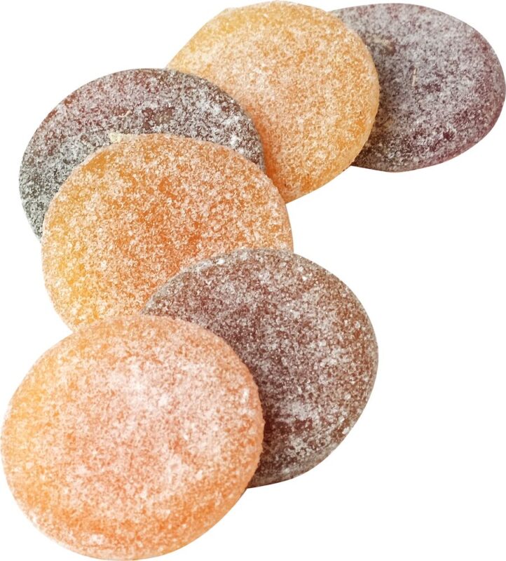 Sockrad konfektyr med lakrits-salmiak-, persika- och karamellsmak