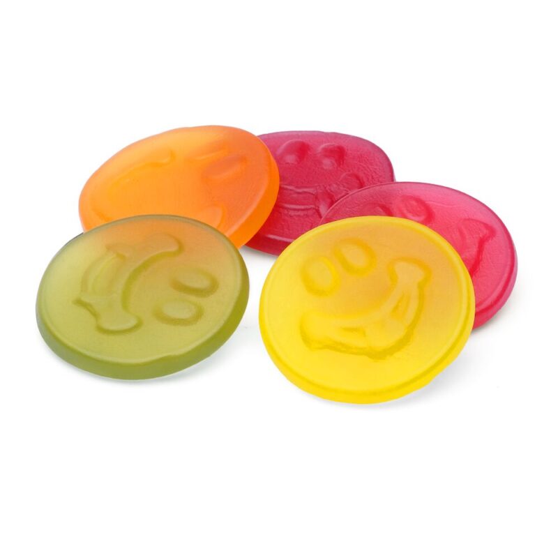 MIX AV VINGUMMI MED FRUKTSMAK Ingredienser: glukossirap, socker/sukker, stärkelse/stivelse, syra (citronsyra), surhetsreglerande medel (trinatriumcitrat), naturliga aromer, vegetabiliska oljor (kokos, raps), koncentrat från (svart morot/sort gulerod, svarta vinbär/solbær, morot/gulerod/gulrod, spirulina, safflor/saflor), ytbehandlings-/overfladebehandlingsmiddel (bivax/bivoks), färgämnen/farvestoffer (E160c, E100).