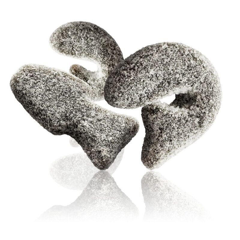 KONFEKTYR Ingredienser: socker, glukossirap, stärkelse, modifierad stärkelse, glukos-fruktossirap, ammoniumklorid (=salmiak), lakritsextrakt, färgämne (E153), arom.