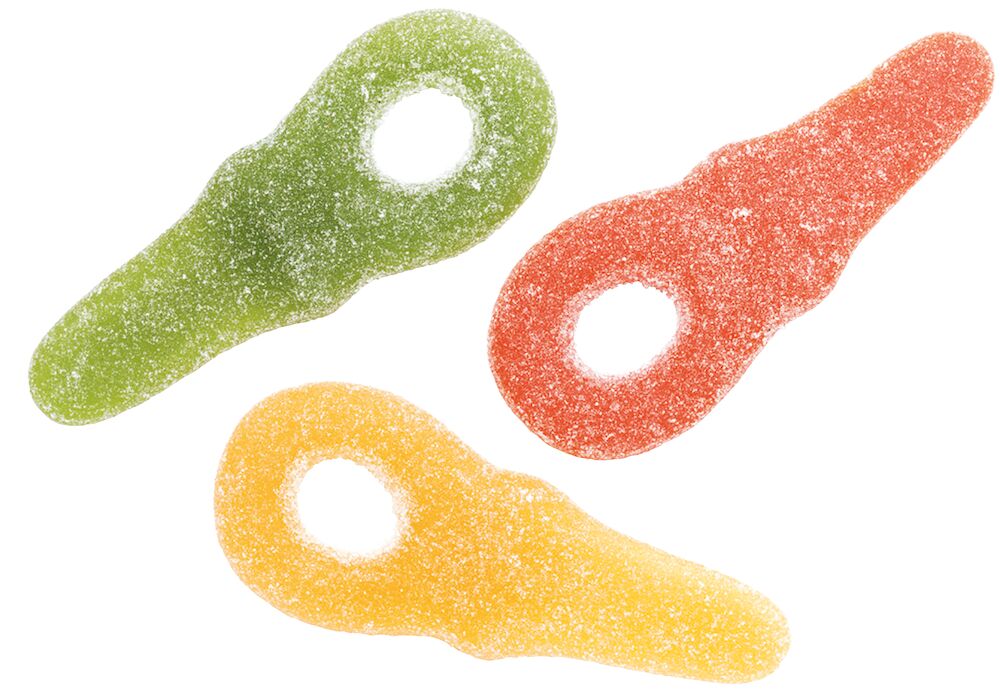 KONFEKTYR Ingredienser: socker, glukossirap, stärkelse, syra (citronsyra), aromer, färgämnen (E141, E160e, E160a).