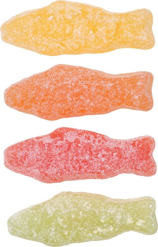 SURSOCKRADE VINGUMMI MED FRUKTSMAKER/SURSUKKEREDE VINGUMMI MED FRUGTSMAG Ingredienser: socker/sukker, glukossirap, stärkelse/stivelse, syror (citronsyra, vinsyra), naturliga aromer, surhetsreglerande medel (E524), färgämnen/farvestoffer (E160e, E141, E160a).